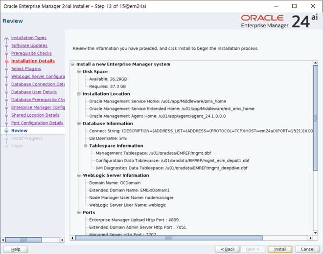 기본적으로 First available port 를 사용하게 되어 있으나, 보통 upload Port 는 4889 (http), 1159 (https) 를 지정하며 Console Port 는 7788 (http), 7803 (https) 를 지정하도록 한다. Review 화면, 설정 값들을 확인하고 이상 없다면 [Install] 선택