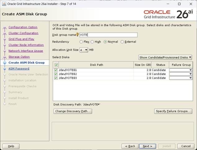 [VOTE 디스크 지정 후, Next] 여기서는 Normal로 구성함