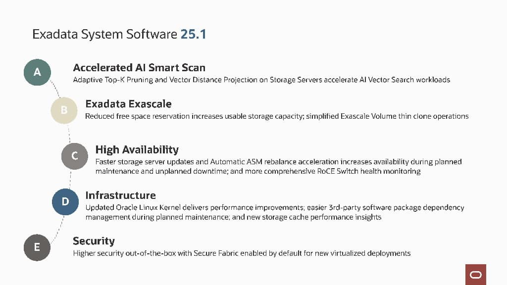 Exadata System Software 25.1은 2024년 12월에 발표 및 출시되었습니다. 여기에는 X11M 하드웨어 지원과 AI Smart Scan 최적화, Exadata Exascale 스토리지 관리, 성능, 가용성, 운영 효율성 및 보안을 높이기 위한 더 빠른 ASM 리밸런싱 작업 등 많은 새로운 소프트웨어 기능이 포함됩니다.